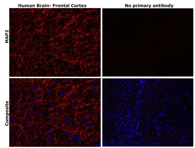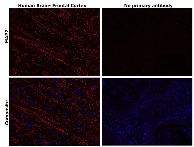 MAP2 (Microtubule Associated Protein 2) exists in two high molecular weight forms (MAP2a & MAP2b) and a low molecular weight form. The expression of MAP2 is developmentally regulated and its multiple forms arise by alternative splicing of a single gene. MAP2 is involved in microtubule assembly, which is an essential step in neurogenesis. The products of similar genes in rat and mouse are neuron-specific cytoskeletal proteins that are enriched in dendrites, implicating a role in determining and stabilizing dendritic shape during neuron development. MAP2 is useful in studies of neuron structure in normal and malignant brain tissue as well as in degenerative diseases such as Alzheimer's Disease (AD).