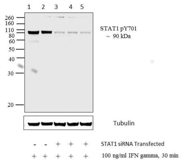 This antibody reacts specifically with the tyrosine-701 phosphorylated form of STAT1 and does not exhibit appreciable cross-reactivity with corresponding tyrosine phosphorylated forms of other STAT proteins or with other endogenous phosphotyrosine-containing proteins. To confirm the exclusive recognition of tyrosine phosphorylated STAT1, Western blots were carried out on lysates of 293 cells transfected with a STAT1 expression vector together with a wild type or kinase 'dead' JAK1 expression vector. In addition, recognition of endogenous tyrosine phosphorylated STAT1 was confirmed on Western blots with cell lysates derived from serum starved or EGF-stimulated A431 cells and on Western blots with IFNa-stimulated mouse embryo fibroblast lysates.