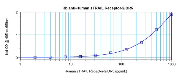 AA Sequence of recombinant protein: MESALITQQD LAPQQRVAPQ QKRSSPSEGL CPPGHHISED GRDCISCKYG QDYSTHWNDL LFCLRCTRCD SGEVELSPCT TTRNTVCQCE EGTFREEDSP EMCRKCRTGC PRGMVKVGDC TPWSDIECVH KES. Preparation: Produced from sera of rabbits immunized with highly pure Recombinant Human sTRAIL Receptor-2. Anti-Human sTRAIL Receptor-2-specific antibody was purified by affinity chromatography employing an immobilized Human sTRAIL Receptor-2 matrix. Sandwich ELISA: To detect Human sTRAIL Receptor-2 by sandwich ELISA (using 100 μL/well antibody solution) a concentration of 0.5-2.0 μg/mL of this antibody is required. This antigen affinity purified antibody, in conjunction with PeproTech Biotinylated Anti-Human sTRAIL Receptor-2 (500-P299Bt) as a detection antibody, allows the detection of at least 0.2-0.4 ng/well of Recombinant Human sTRAIL Receptor-2. Western Blot: To detect hsTRAIL Receptor-2 by Western Blot analysis this antibody can be used at a concentration of 0.1-0.2 μg/mL. Used in conjunction with compatible secondary reagents the detection limit for Recombinant hsTRAIL Receptor-2 is 1.5-3.0 ng/lane, under either reducing or non-reducing conditions.